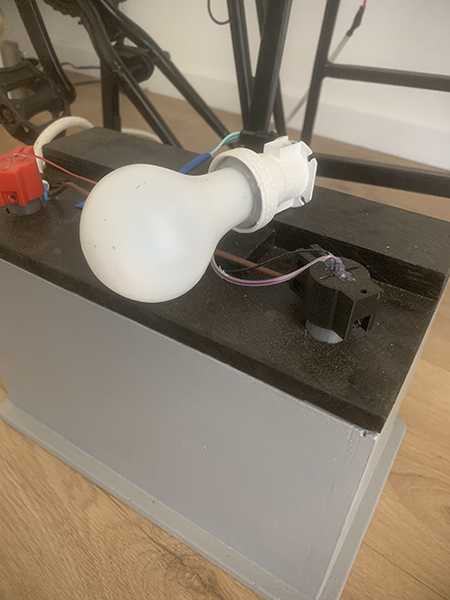 Tabouret qui produit de l'éléctricité, quand on pédale une ampoule s'allume Arduino nano Led Strip pour la Cie L'embrayllage à paillette.